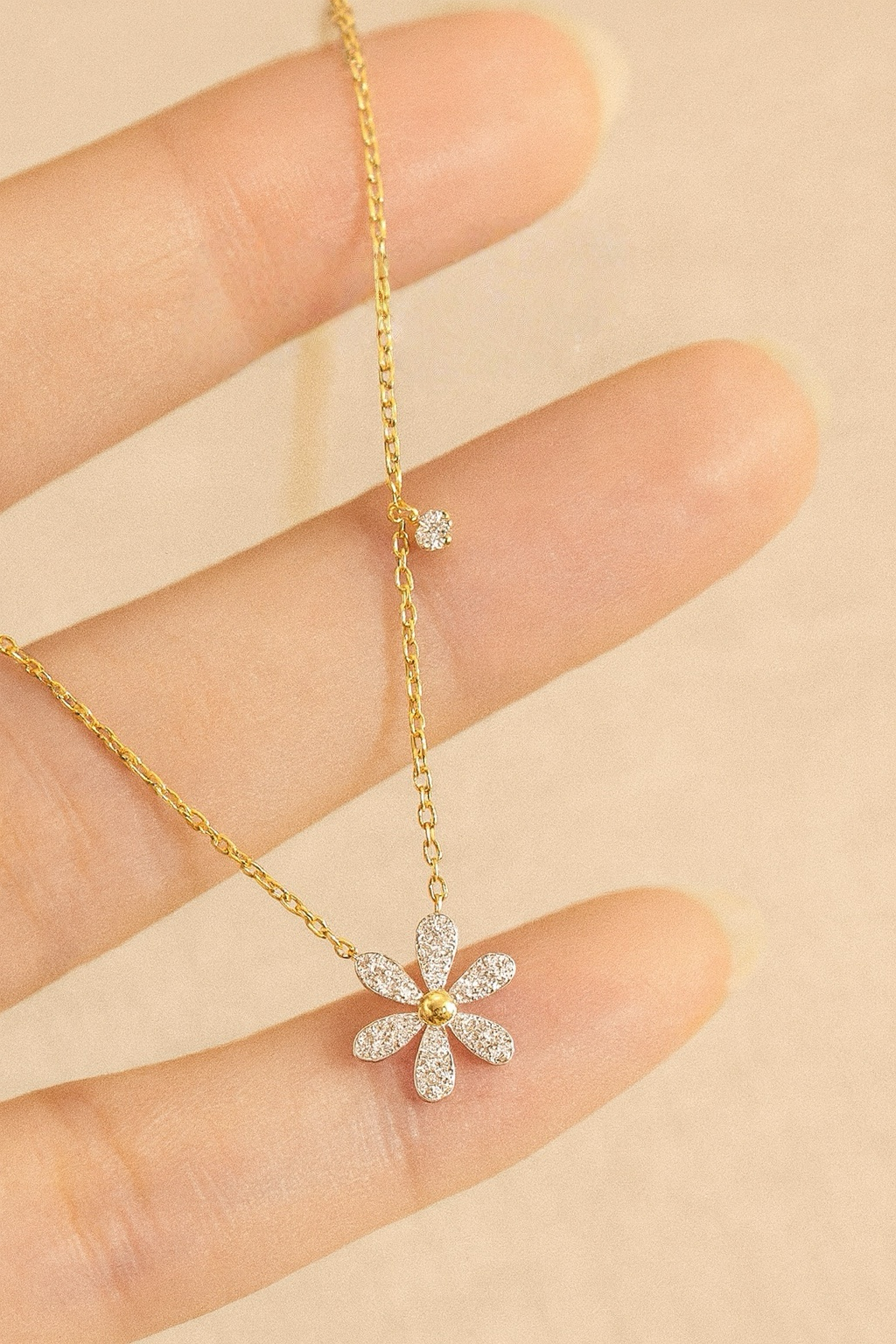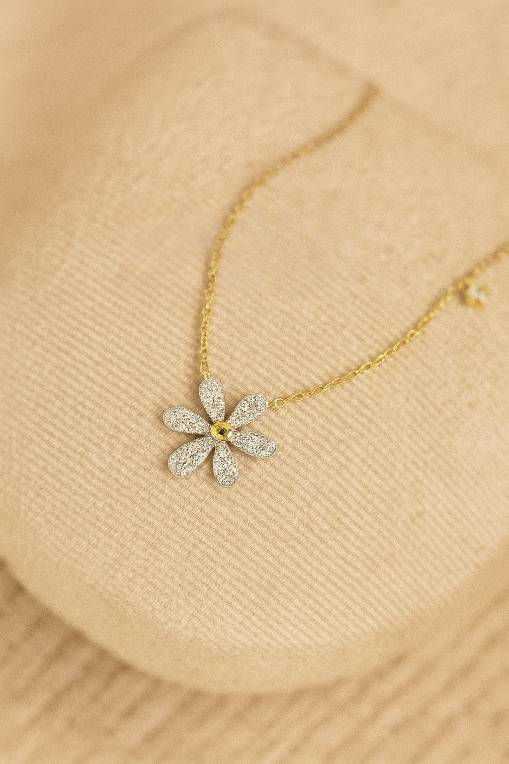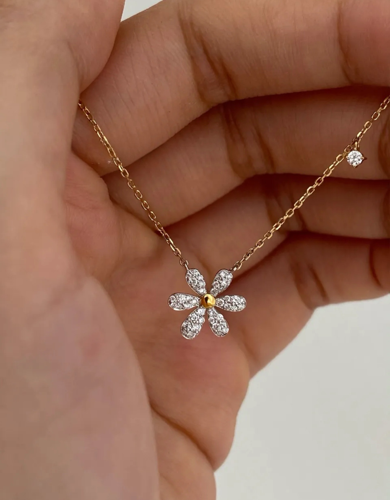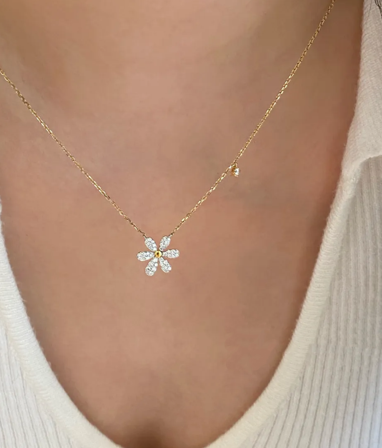 Bring timeless elegance and a touch of nature’s beauty to your everyday style with this delicate daisy pendant necklace. Crafted in solid 18K gold, the daisy flower sparkles with natural diamonds (~0.25ct total) carefully pavé-set on each petal, finished with a warm golden center.